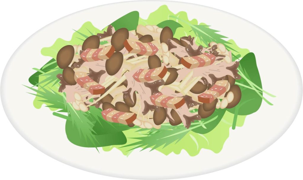 いつものサラダにソテーやレンチン等加熱したきのこをくわえるだけ。